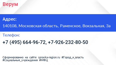 Верум по адресу 140108, Московская область, Раменское, Вокзальная, 3а в дальнейшем Организация, размещена в следующих категориях:
