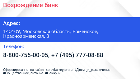 Возрождение, банк по адресу 140109, Московская область, Раменское, Красноармейская, 3 в дальнейшем Организация, размещена в следующих категориях: