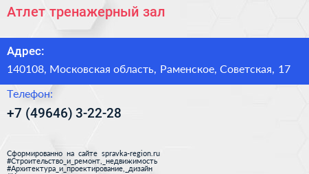 Атлет, тренажерный зал по адресу 140108, Московская область, Раменское, Советская, 17 в дальнейшем Организация, размещена в следующих категориях: