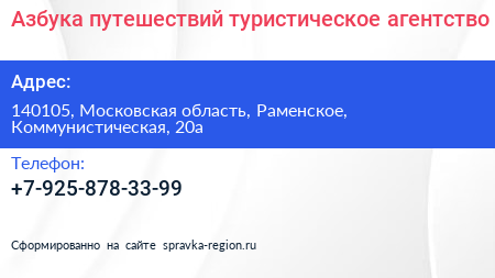 Азбука путешествий, туристическое агентство по адресу 140105, Московская область, Раменское, Коммунистическая, 20а в дальнейшем Организация, размещена в следующих категориях: