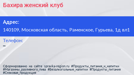 Бахира, женский клуб по адресу 140109, Московская область, Раменское, Гурьева, 1д вл1 в дальнейшем Организация, размещена в следующих категориях: