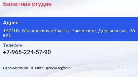 Балетная студия по адресу 140103, Московская область, Раменское, Дергаевская, 36 вл1 в дальнейшем Организация, размещена в следующих категориях: