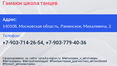 Гамаюн, школа танцев по адресу 140108, Московская область, Раменское, Михалевича, 2 в дальнейшем Организация, размещена в следующих категориях: