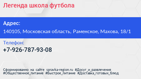 Легенда, школа футбола по адресу 140105, Московская область, Раменское, Махова, 18/1 в дальнейшем Организация, размещена в следующих категориях: