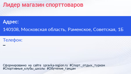 Лидер, магазин спорттоваров по адресу 140108, Московская область, Раменское, Советская, 1Б в дальнейшем Организация, размещена в следующих категориях: