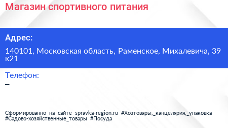 Магазин спортивного питания по адресу 140101, Московская область, Раменское, Михалевича, 39 к21 в дальнейшем Организация, размещена в следующих категориях: