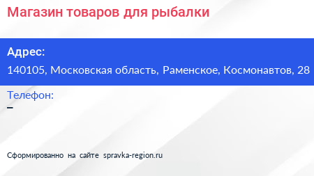 Магазин товаров для рыбалки по адресу 140105, Московская область, Раменское, Космонавтов, 28 в дальнейшем Организация, размещена в следующих категориях: