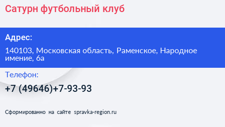 Сатурн, футбольный клуб по адресу 140103, Московская область, Раменское, Народное имение, 6а в дальнейшем Организация, размещена в следующих категориях: