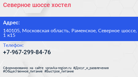 Северное шоссе, хостел по адресу 140105, Московская область, Раменское, Северное шоссе, 1 к15 в дальнейшем Организация, размещена в следующих категориях: