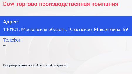 Dow, торгово-производственная компания по адресу 140101, Московская область, Раменское, Михалевича, 69 в дальнейшем Организация, размещена в следующих категориях: