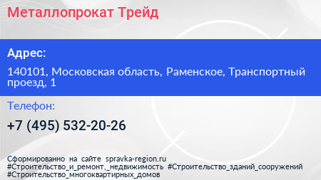 Металлопрокат Трейд по адресу 140101, Московская область, Раменское, Транспортный проезд, 1 в дальнейшем Организация, размещена в следующих категориях: