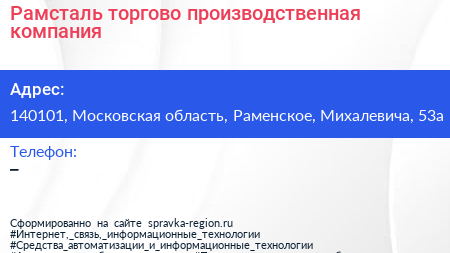 Рамсталь, торгово-производственная компания по адресу 140101, Московская область, Раменское, Михалевича, 53а в дальнейшем Организация, размещена в следующих категориях: