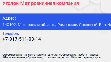 Уголок Мет, розничная компания по адресу 140102, Московская область, Раменское, Сосновый Бор, 4а в дальнейшем Организация, размещена в следующих категориях: