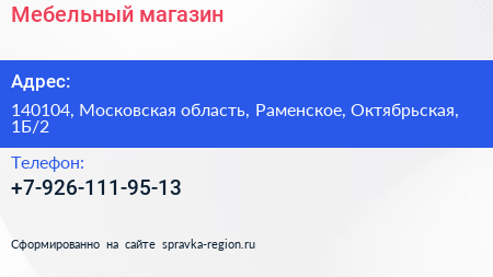 Мебельный магазин по адресу 140104, Московская область, Раменское, Октябрьская, 1Б/2 в дальнейшем Организация, размещена в следующих категориях: