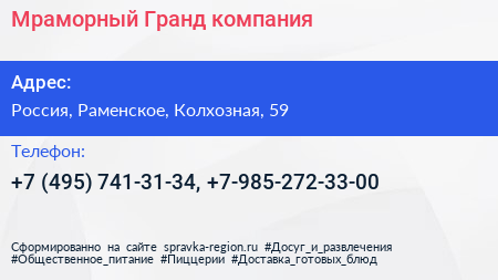 Мраморный Гранд, компания по адресу Ремонт грузовой техники, улица Гагарина, Коттеджный посёлок "Малиновка Ленд", Старково, Раменский городской округ, Московская область, Центральный федеральный округ, 140127, Россия в дальнейшем Организация, размещена в следующих категориях:
