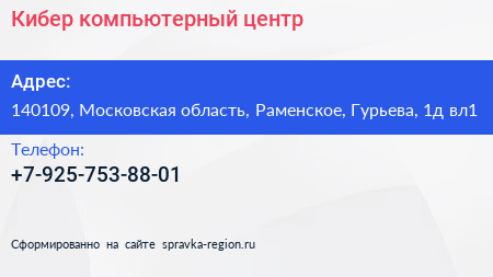 Кибер, компьютерный центр по адресу 140109, Московская область, Раменское, Гурьева, 1д вл1 в дальнейшем Организация, размещена в следующих категориях: