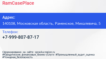 RamCasePlace по адресу 140108, Московская область, Раменское, Михалевича, 5 в дальнейшем Организация, размещена в следующих категориях:
