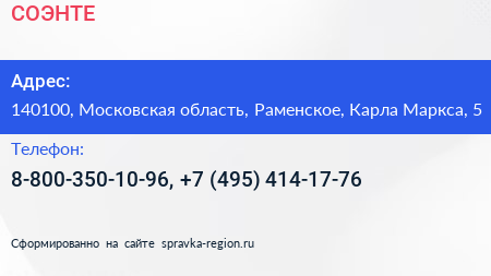 СОЭНТЕ по адресу 140100, Московская область, Раменское, Карла Маркса, 5 в дальнейшем Организация, размещена в следующих категориях: