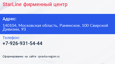 StarLine, фирменный центр по адресу 140104, Московская область, Раменское, 100 Свирской Дивизии, 93 в дальнейшем Организация, размещена в следующих категориях: