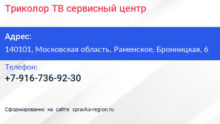 Триколор ТВ, сервисный центр по адресу 140101, Московская область, Раменское, Бронницкая, 6 в дальнейшем Организация, размещена в следующих категориях: