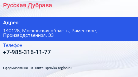 Русская Дубрава по адресу 140128, Московская область, Раменское, Производственная, 33 в дальнейшем Организация, размещена в следующих категориях: