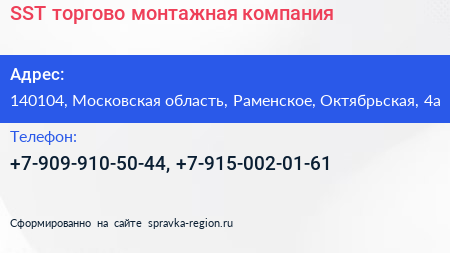 SST, торгово-монтажная компания по адресу 140104, Московская область, Раменское, Октябрьская, 4а в дальнейшем Организация, размещена в следующих категориях: