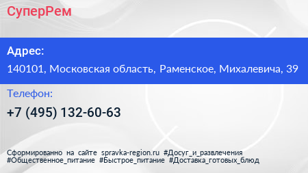 СуперРем по адресу 140101, Московская область, Раменское, Михалевича, 39 в дальнейшем Организация, размещена в следующих категориях: