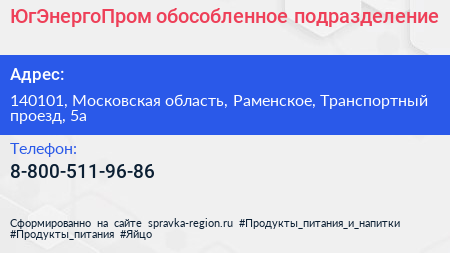 ЮгЭнергоПром, обособленное подразделение по адресу 140101, Московская область, Раменское, Транспортный проезд, 5а в дальнейшем Организация, размещена в следующих категориях: