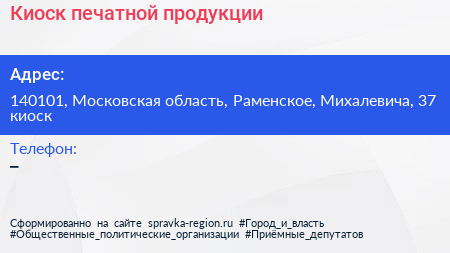Киоск печатной продукции по адресу 140101, Московская область, Раменское, Михалевича, 37 киоск в дальнейшем Организация, размещена в следующих категориях: