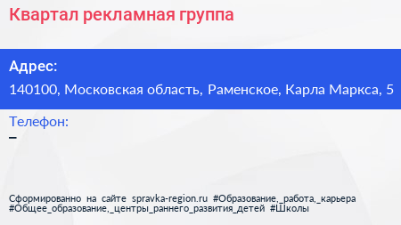 Квартал, рекламная группа по адресу 140100, Московская область, Раменское, Карла Маркса, 5 в дальнейшем Организация, размещена в следующих категориях: