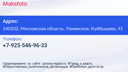 Maksfoto по адресу 140102, Московская область, Раменское, Куйбышева, 41 в дальнейшем Организация, размещена в следующих категориях: