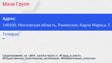 Маза Групп по адресу 140100, Московская область, Раменское, Карла Маркса, 5 в дальнейшем Организация, размещена в следующих категориях: