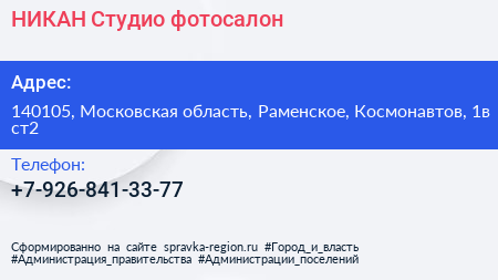 НИКАН Студио, фотосалон по адресу 140105, Московская область, Раменское, Космонавтов, 1в ст2 в дальнейшем Организация, размещена в следующих категориях: