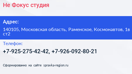 Не Фокус, студия по адресу 140105, Московская область, Раменское, Космонавтов, 1в ст2 в дальнейшем Организация, размещена в следующих категориях: