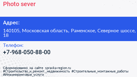 Photo-sever по адресу 140105, Московская область, Раменское, Северное шоссе, 18 в дальнейшем Организация, размещена в следующих категориях: