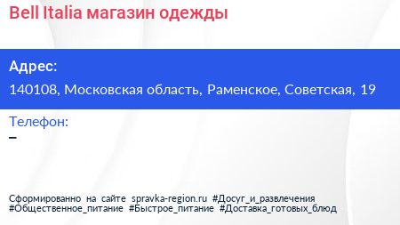 Bell`Italia, магазин одежды по адресу 140108, Московская область, Раменское, Советская, 19 в дальнейшем Организация, размещена в следующих категориях: