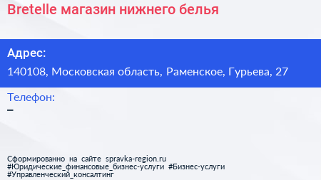 Bretelle, магазин нижнего белья по адресу 140108, Московская область, Раменское, Гурьева, 27 в дальнейшем Организация, размещена в следующих категориях: