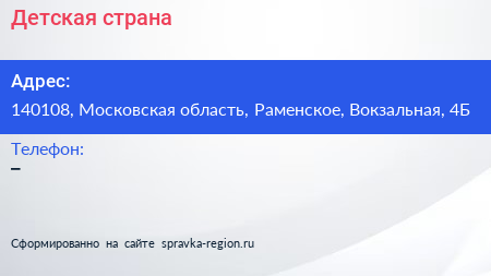 Детская страна по адресу 140108, Московская область, Раменское, Вокзальная, 4Б в дальнейшем Организация, размещена в следующих категориях:
