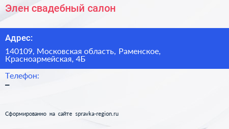 Элен, свадебный салон по адресу 140109, Московская область, Раменское, Красноармейская, 4Б в дальнейшем Организация, размещена в следующих категориях: