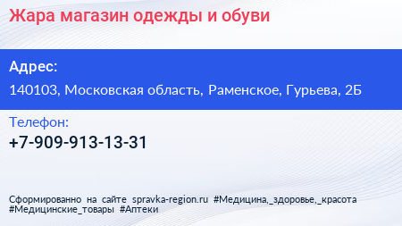 Жара, магазин одежды и обуви по адресу 140103, Московская область, Раменское, Гурьева, 2Б в дальнейшем Организация, размещена в следующих категориях: