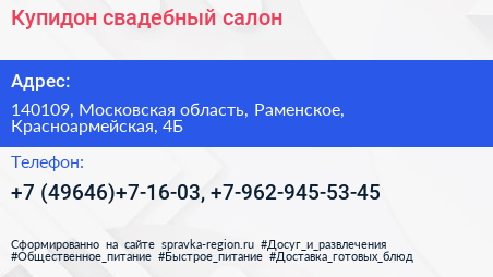 Купидон, свадебный салон по адресу 140109, Московская область, Раменское, Красноармейская, 4Б в дальнейшем Организация, размещена в следующих категориях: