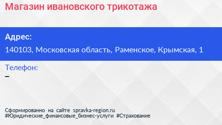Магазин ивановского трикотажа по адресу 140103, Московская область, Раменское, Крымская, 1 в дальнейшем Организация, размещена в следующих категориях: