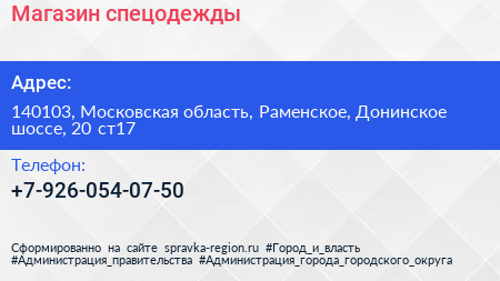 Магазин спецодежды по адресу 140103, Московская область, Раменское, Донинское шоссе, 20 ст17 в дальнейшем Организация, размещена в следующих категориях: