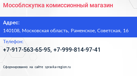 Мособлскупка, комиссионный магазин по адресу 140108, Московская область, Раменское, Советская, 16 в дальнейшем Организация, размещена в следующих категориях: