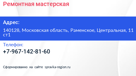 Ремонтная мастерская по адресу 140128, Московская область, Раменское, Центральная, 11 ст1 в дальнейшем Организация, размещена в следующих категориях: