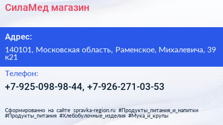 СилаМед, магазин по адресу 140101, Московская область, Раменское, Михалевича, 39 к21 в дальнейшем Организация, размещена в следующих категориях: