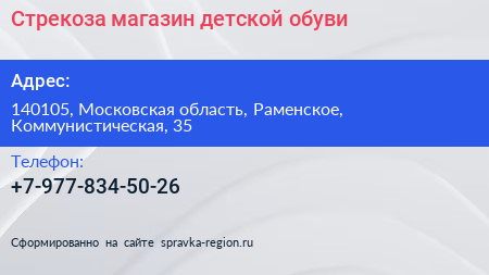 Стрекоза, магазин детской обуви по адресу 140105, Московская область, Раменское, Коммунистическая, 35 в дальнейшем Организация, размещена в следующих категориях: