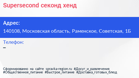 Supersecond, секонд-хенд по адресу 140108, Московская область, Раменское, Советская, 1Б в дальнейшем Организация, размещена в следующих категориях: