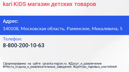 kari KIDS, магазин детских товаров по адресу 140108, Московская область, Раменское, Михалевича, 5 в дальнейшем Организация, размещена в следующих категориях: