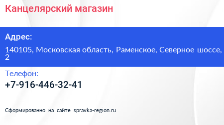 Канцелярский магазин по адресу 140105, Московская область, Раменское, Северное шоссе, 2 в дальнейшем Организация, размещена в следующих категориях: